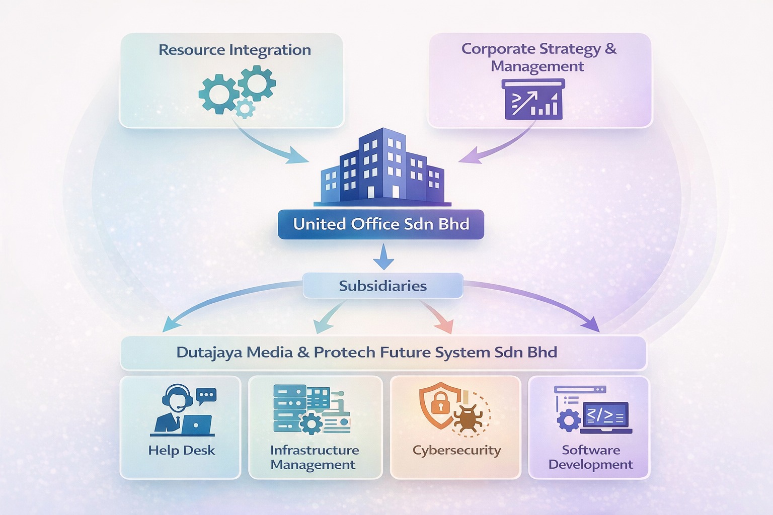 United Office Sdn Bhd is the strategic nucleus of the DutaJaya Media Sdn Bhd and Protech Future System Sdn Bhd. We provide the integrated framework of business leadership and technology insight that empowers our subsidiaries to build, scale, and lead.